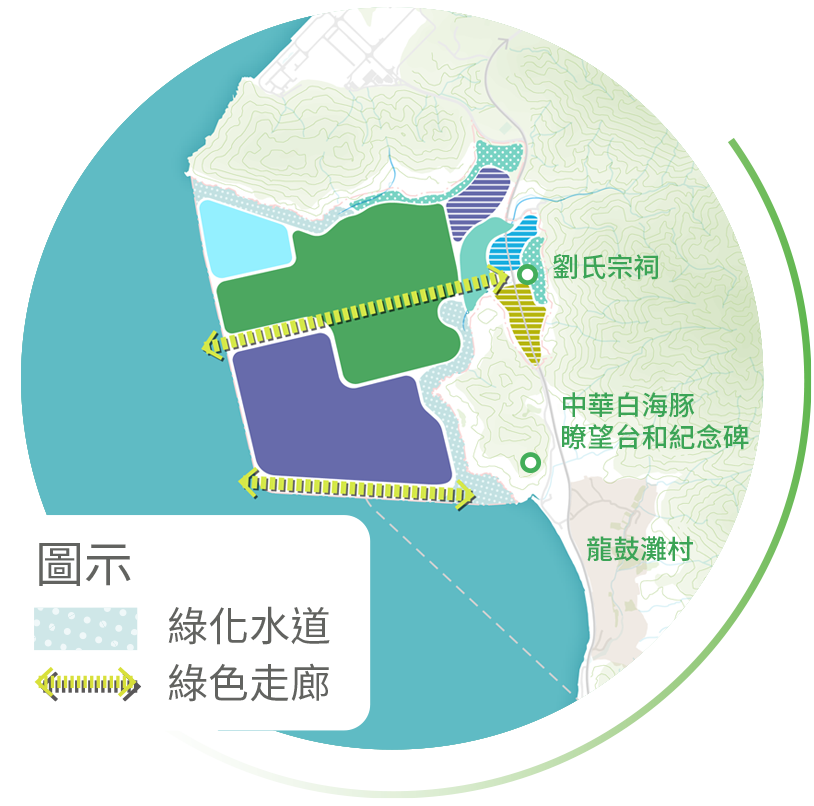 提升環境容量保留龍鼓灘村的天然海灘及前方水體,亦不會影響該區現有具重要生態價值的地區。為加強地區的生物多樣性,建議在龍鼓灘填海區以北和以東沿岸提供兩條綠化水道,保存大部分現有天然海岸線。同時鼓勵親水文化設計、引入生態海岸線和增加美化 / 綠化帶建設,締造宜人且多元化的公共空間。